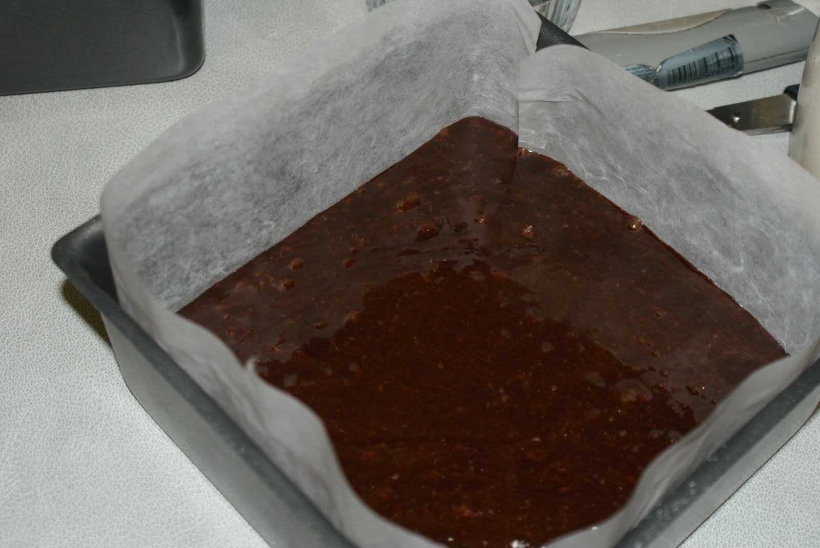 Once thoroughly combined pour the mixture into the prepared baking pan.