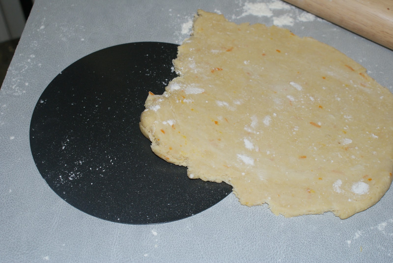 Wrap the pastry in clingfilm and allow to chill in the fridge for 30 minutes to let it rest.Preheat the oven to 180c Fan/200c/Gas Mark 6.Roll out on a well floured surface. Keep turning the pastry around and lift it using the flat removable base from a cake or flan tin – that way you can make sure it isn’t sticking. Roll out to approx 3mm thick.
